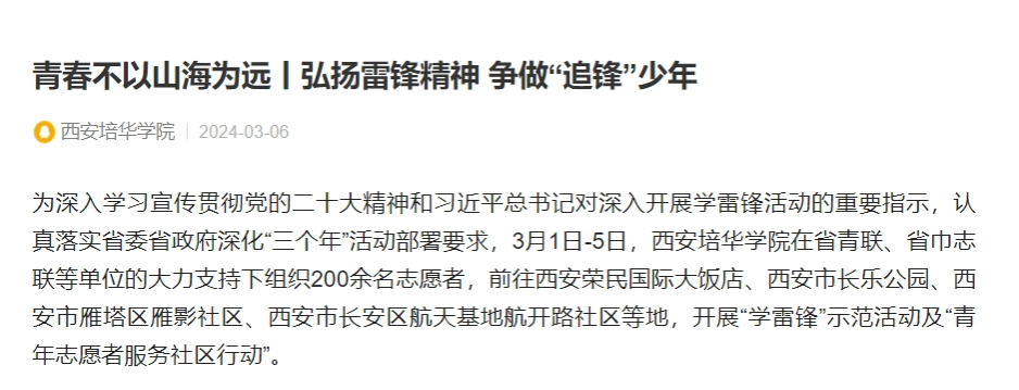 下一步,学校将以学习雷锋精神为契机,多部门联动,常态化在校内外广泛开展志愿服务活动,大力弘扬“奉献、友爱、互助、进步”的志愿精神,营造“人人学雷锋,人人做雷锋”的氛围,为新中国75周年和培华建校96周年校庆贡献青春力量。