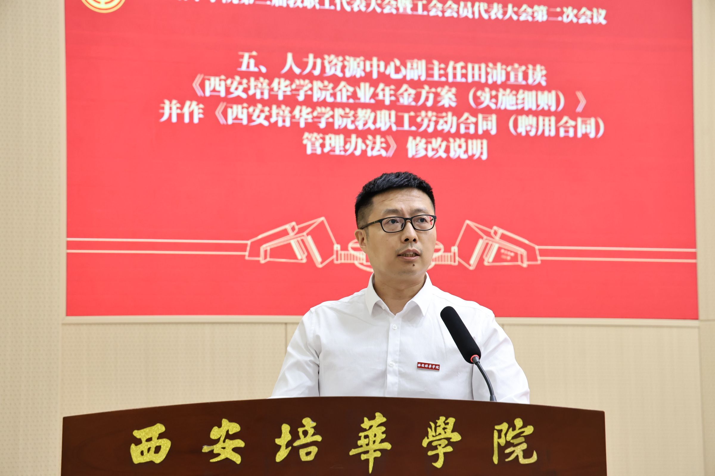人力资源中心副主任田沛宣读《九游(中国)企业年金方案(实施细则)》并作《九游(中国)教职工劳动合同(聘用合同)管理办法》修改说明