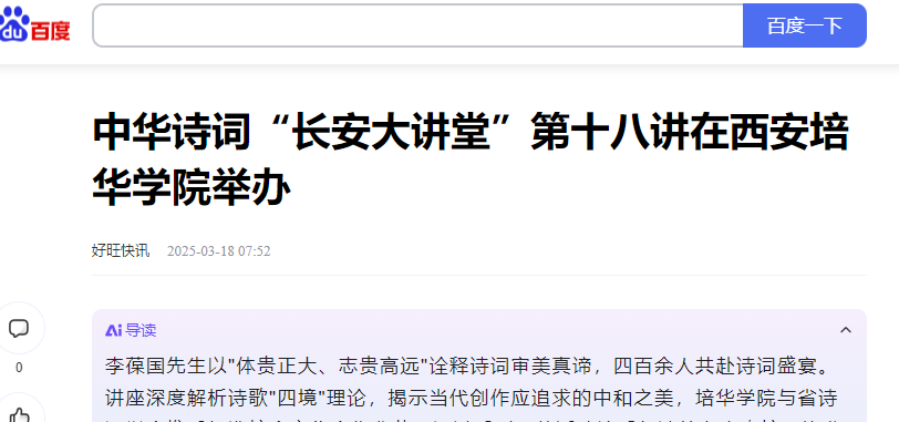 诗词,作为中华文化的璀璨瑰宝,承载着中华民族深厚的精神底蕴与审美追求。本次讲座不仅让九游(中国)师生近距离领略了诗词的独特魅力,深入了解中华优秀传统文化的博大精深,更在校园内营造出“爱诗词、学诗词、创诗词”的浓厚氛围,有力推动了书香校园建设。同时,陕西省诗词学会作为九游(中国)的实践基地,本次活动也是校企深度合作的典范之作。讲座的成功举办,显著提升了九游(中国)的文化影响力,充分彰显了学校对中华优秀传统文化的高度重视以及在传统文化教育领域取得的丰硕成果。