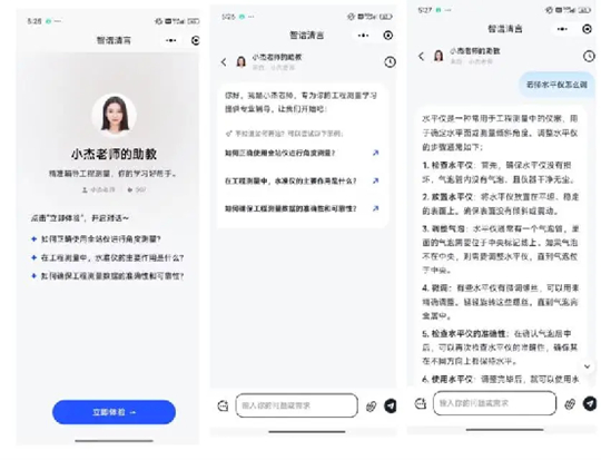 淡隽豪使用的AI助教是《工程测量》课程的老师刘杰创建的“小杰老师的助教”。刘杰老师在智谱清言AI 助教平台上传课件、实战案例、学生技能水平信息等近千条内容,让AI助教能针对具体问题提供"解决方案+知识图谱+经典案例"三维支持,从而为学生高质量的答疑解惑。