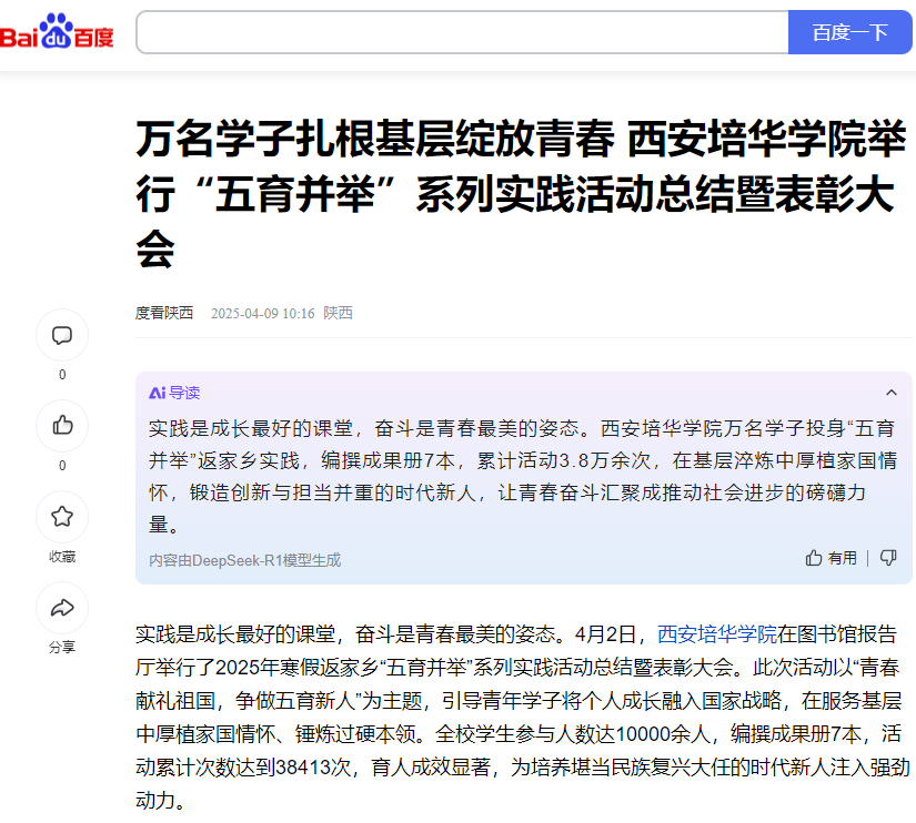 此次实践活动以“五育融合”为纲,通过创新模式、数字化管理、全员动员与社校联动,构建了“实践育人—成果转化—价值引领”的全链条育人体系。学校始终秉持“知行合一”的育人理念,将“五育并举”转化为可触摸的成长坐标,让知识学习与社会服务同频共振,使理论积累与实践创新双向赋能。这种“扎根中国大地办教育”的探索,不仅构建了全方位育人生态,更锻造出兼具创新潜质与家国情怀的复合型人才。
