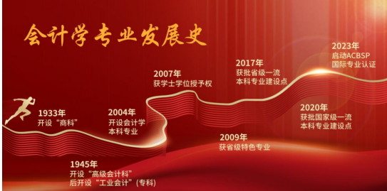 学院早在1945年培华职校时期就开设了“高级会计科”,经过长期的建设和改革,获得了社会普遍认可并享有较高社会声誉。2007年最早获得“管理学学士学位授予权”;2009年获批“省级特色专业”建设项目;2010年获批“省级重点扶持专业”建设项目;2017年获批“省级一流专业”建设项目;2020年获批“双万计划”国家级一流本科专业建设点;2023年成为ACBSP商科专业认证会员,持续推进专业认证工作。