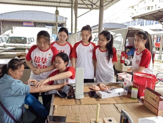 12日中台镇农贸集市人声鼎沸。队员们身披“康宁守护”绶带,将针灸文化图谱展于摊前,引菜农争相围观;急救知识讲解处,团队成员梁欢与史媛媛躬身示范海姆立克法,右拳抵胸骨下方向内上方迅猛冲击。“‘剪刀、石头、布’定生死!”她们高声讲解,以两指定位脐上横指处,强调“果断冲击膈肌下软组织,靠气流冲开阻塞气道”。菜农李大婶现场模仿,队员反复矫正其动作力道。这一幕诠释了皇甫谧“通络疏滞”医理与现代急救术的共鸣——在生命最脆弱的瞬息,中西智慧共铸生命防线。