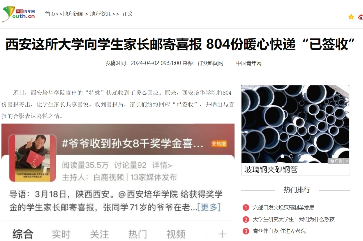 喜报传递着喜悦和祝福,也彰显着培华学子勤奋、刻苦的荣耀成果。通过寄送喜报的形式,学校让家长共同见证了学生的成长,收获了喜悦。“你的拼搏与努力,培华看在眼里,父母看在眼里,时光看在眼里。谨以此喜报祝福努力奔跑的培华人。”一位教师说,希望广大学子以“闪光者”为榜样,用奋斗填涂青春底色,展现青春最美的模样。