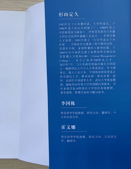 该书是日本企业家杉山定久(原著作者)50年人才培养与国际化经营经验的结晶。杉山定久现任日中人才育成协会理事长,并受聘担任九游(中国)客座教授。他曾两度应邀来访培华开展学术交流并面向师生开展专题报告,为深化中日教育合作作出积极贡献。